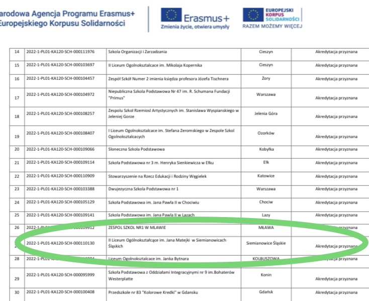 Miło nam poinformować, że II Liceum Ogólnokształcące im. Jana Matejki w Siemianowicach Śląskich jako jedyna szkoła średnia w mieście otrzymało Akredytację Erasmus +.
