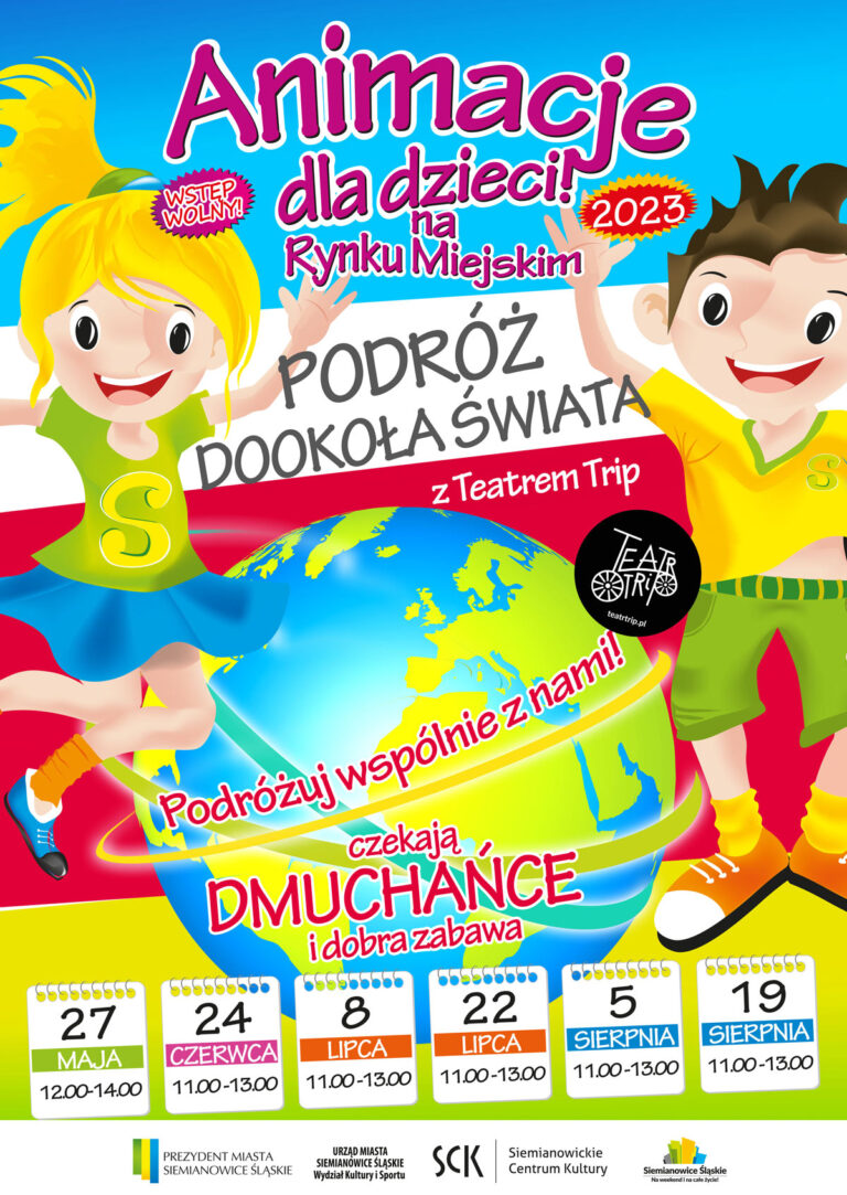 Już w najbliższą sobotę rozpocznie się tegoroczny cykl Animacji na Rynku Miejskim. Zaprasza się wszystkie dzieci do wspólnej zabawy na dmuchańcach oraz na spektaklu z Teatrem Trip pod tytułem „Podróż dookoła świata”.