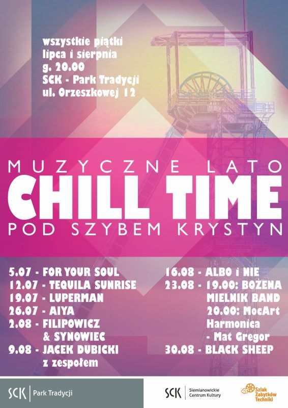 Różnorodność stylów muzycznych sprawia, że każdy koncert będzie inny. I o to właśnie chodzi, by na wyjątkowej estradzie pod szybem Krystyn, mogli zaprezentować się różni wykonawcy i zespoły. Z założenia nie koncertują tu „mega gwiazdy”, bo to nie jest estrada dla nich. Tworząc przed laty wakacyjne koncerty „Chill Time”, SCK dało możliwość pokazania się wykonawcom i zespołom, które są na początku swojej muzycznej drogi. Zdarza się, że zawitają tam również uznani już artyści – jak mówią z ciekawości tego wyjątkowego miejsca i widowni. I ten format sprawdza się do dziś. SCK obserwuje to po frekwencji widowni, która licznie bierze udział w każdy piątkowy, wakacyjny wieczór w koncertach.