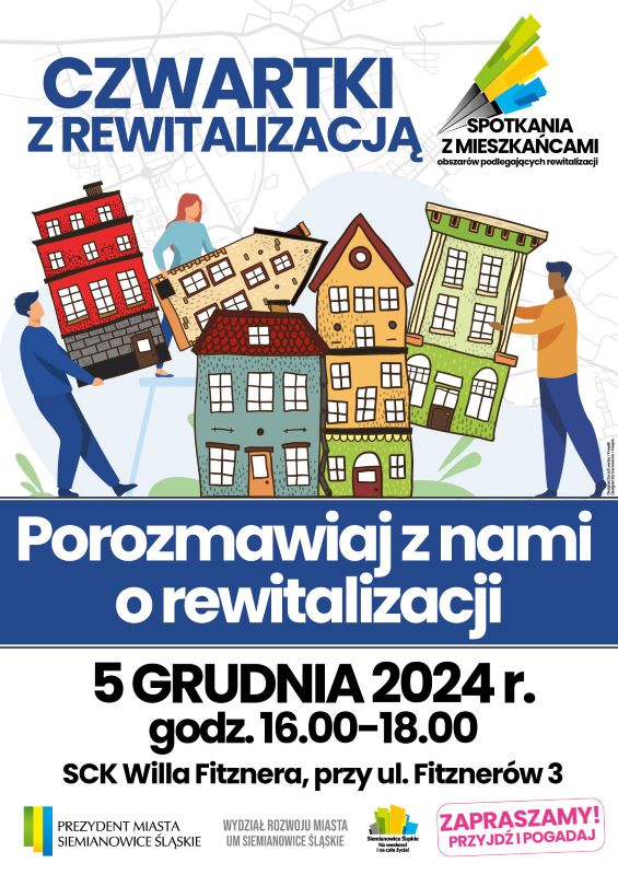 Urząd Miasta zaprasza na kolejne spotkanie w ramach cyklu „Czwartki z rewitalizacją”, które odbędzie się 5 grudnia (czwartek) w godzinach 16:00-18:00. Tematem przewodnim spotkania będą projekty rewitalizacyjne realizowane w ramach Gminnego Programu Rewitalizacji Miasta Siemianowice Śląskie do 2030 roku.