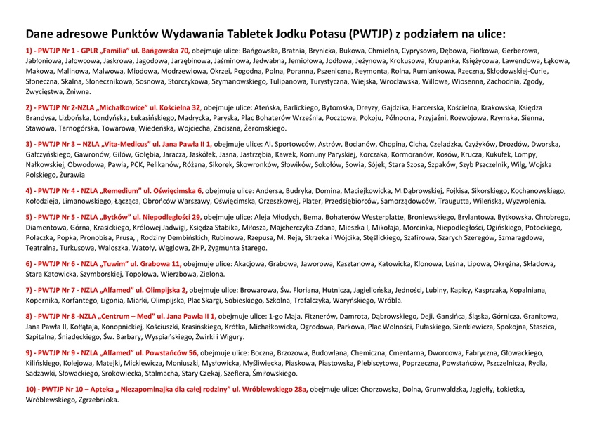 Plan Akcji Jodowej zakłada dystrybucję tabletek z jodkiem potasu wśród mieszkańców miasta w oparciu o wyznaczone punkty wydawania tabletek jodku potasu. Wykaz punktów wraz z przynależnymi ulicami znajduje się poniżej.