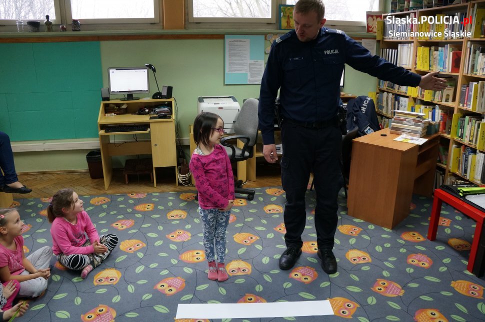 Ciekawe zajęcia przygotowane przez panie bibliotekarki zostały wzbogacone o cenne rady dzielnicowego z zakresu szeroko rozumianego bezpieczeństwa. Policjant przede wszystkim przekazał wiedzę dotyczącą zachowań maluchów w pobliżu ulicy, jak również na samych przejściach dla pieszych. Aby milusińscy byli widoczni na drogach, rozdał każdemu odblaskowe opaski.