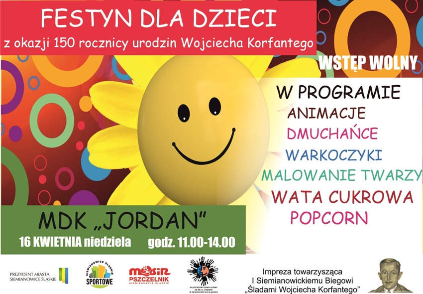 Przy okazji biegu na terenie MDK im. H. Jordana, w godzinach 11.00 – 14.00 zorganizowany zostanie także festyn dla dzieci (animacje, dmuchańce, wata cukrowa, popcorn, malowanie twarzy, warkoczyki). Zaprasza się do kibicowania oraz ze swoimi pociechami do udziału w animacjach.