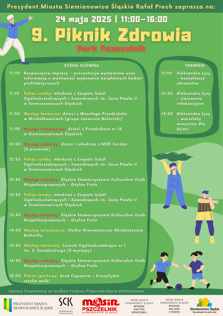 Prezydent Miasta Siemianowice Śląskie, Rafał Piech, zaprasza na IX Piknik Zdrowia, który odbędzie się 24 maja 2025 roku w godzinach 11:00–16:00 na terenie Kompleksu Sportowego Pszczelnik.