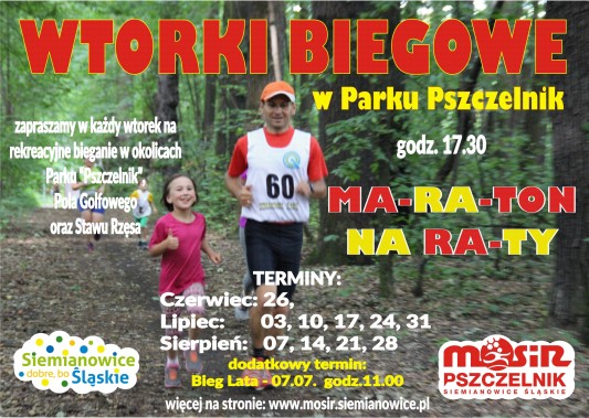 Miejski Ośrodek Sportu i Rekreacji “Pszczelnik” w Siemianowicach Śląskich serdecznie zaprasza miłośników biegania do udziału w dziewiątej edycji, wakacyjnej imprezy rekreacyjnej pod nazwą “Wtorki Biegowe – Maraton na Raty”.