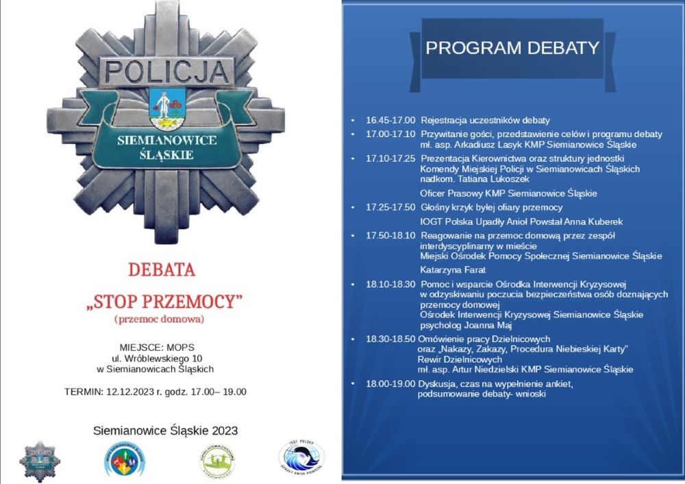 Komendant Miejski Policji w Siemianowicach Śląskich insp. Waldemar Wierzycki wspólnie z Miejskim Ośrodkiem Pomocy Społecznej zapraszają do udziału w debacie pn. “Stop przemocy”, która odbędzie się w dniu 12 grudnia o godzinie 17.00 w budynku należącym do MOPS przy ul. Wróblewskiego 10. Zaproszeni prelegenci z Ośrodka Interwencji Kryzysowej oraz stowarzyszenia “IOGT Polska Upadły Anioł Powstał” podzielą się swoją fachową wiedzą oraz doświadczeniem, które pozwoli zatrzymać przemoc domową.