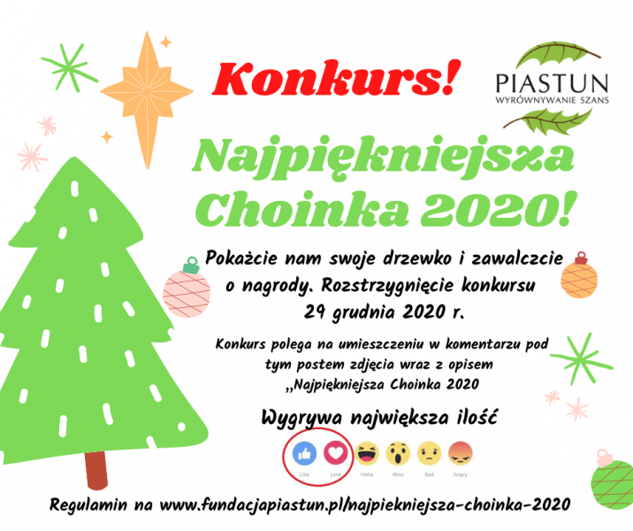 Fundacja Piastun Wyrównywanie Szans – ruszyła na Facebooku z szybkim konkursem świątecznym pt.”Najpiękniejsza Choinka 2020″. W zabawie szukamy najpiękniejszej choinki. Może być tradycyjna, nowoczesna. Aby wziąć udział w konkursie należy pod wpisem na Facebooku Fundacji Piastun, podzielić się zdjęciem swojego drzewka i zawalczyć o nagrody. Rozstrzygnięcie konkursu 29 grudnia 2020 r.