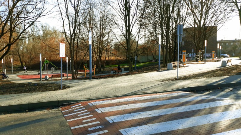 W ramach zagospodarowania terenu powstały również chodniki, uporządkowano zieleń, zamontowano energooszczędne oświetlenie parkowe oraz elementy małej architektury w tym ławki, kosze na śmieci, poidełko i stojak na rowery. Od strony ulicy Słowackiego, w okolicach Szkoły Podstawowej nr 11, powstało wyniesione przejście dla pieszych poprawiające bezpieczeństwo przechodniów.