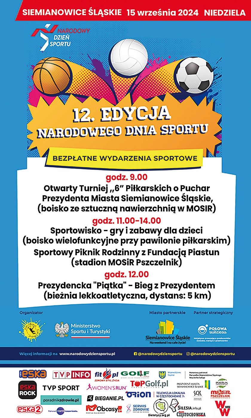Odbędzie się także Otwarty Turniej „6” Piłkarskich o Puchar Prezydenta Miasta Siemianowice Śląskie na boisku piłkarskim ze sztuczną nawierzchnią w Parku Pszczelnik. To cykliczna impreza organizowana przez Urząd Miasta Siemianowice Śląskie oraz MOSiR „Pszczelnik”. Zgłoszenia drużyn przyjmowane są mailowo ([email protected]) do dnia 9 września 2024 r. Ilość miejsc ograniczona (maksymalnie 16 drużyn).