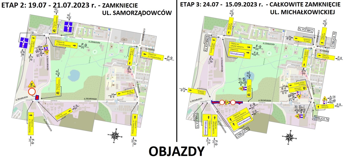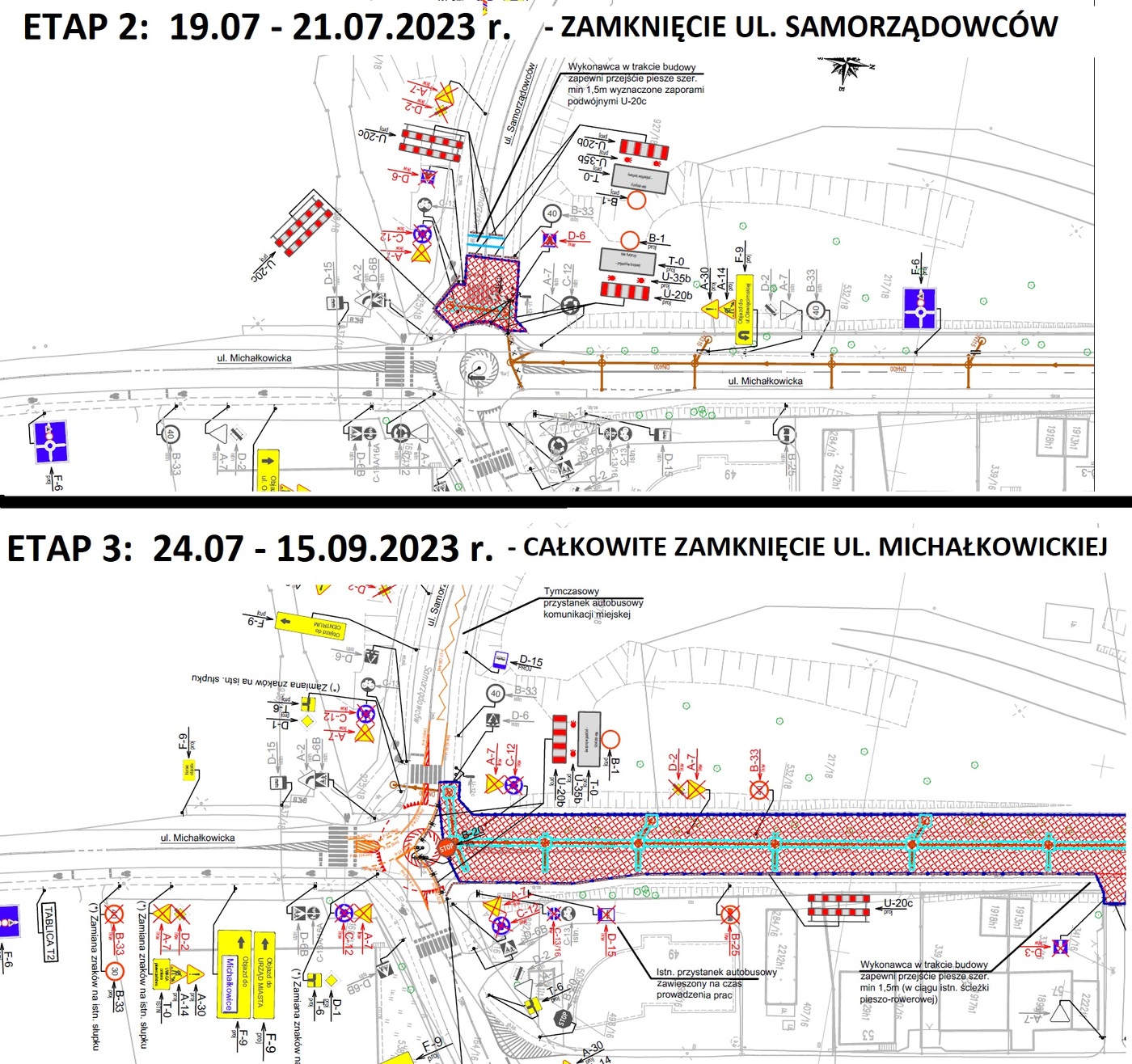 Etap 2: od 19.07.2023 r. do 21.07.2023 r. (3 dni) – zamknięcie fragmentu ul. Samorządowców za zjazdem z ronda. Podczas realizacji prac w ramach tego etapu ul. Michałkowicka będzie całkowicie przejezdna.