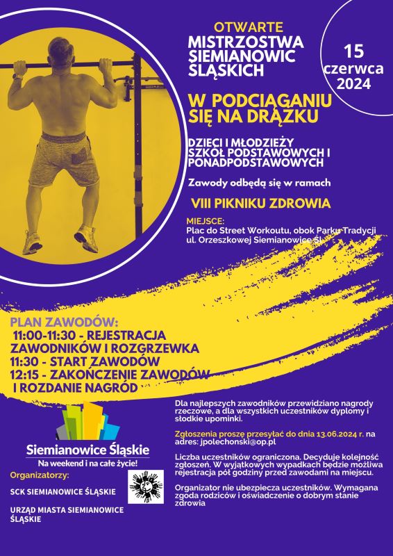 15 czerwca w ramach VIII Pikniku Zdrowia odbędą się Otwarte Mistrzostwa Siemianowic Śl. w Podciąganiu na Drążku Dzieci Szkół Podstawowych i Ponadpodstawowych. Organizatorem imprezy jest: Urząd Miasta Siemianowice Śl. i Młodzieżowy Dom Kultury im. dr. Henryka Jordana w Siemianowicach Śląskich (MDK).