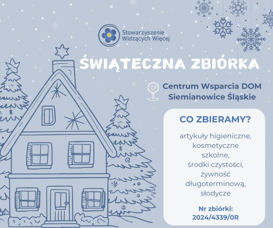 Stowarzyszenie Widzących Więcej, które aktywnie działa w naszym regionie, ponownie zaprasza do wsparcia przedświątecznej zbiórki dla Centrum Wsparcia DOM w Siemianowicach Śląskich.