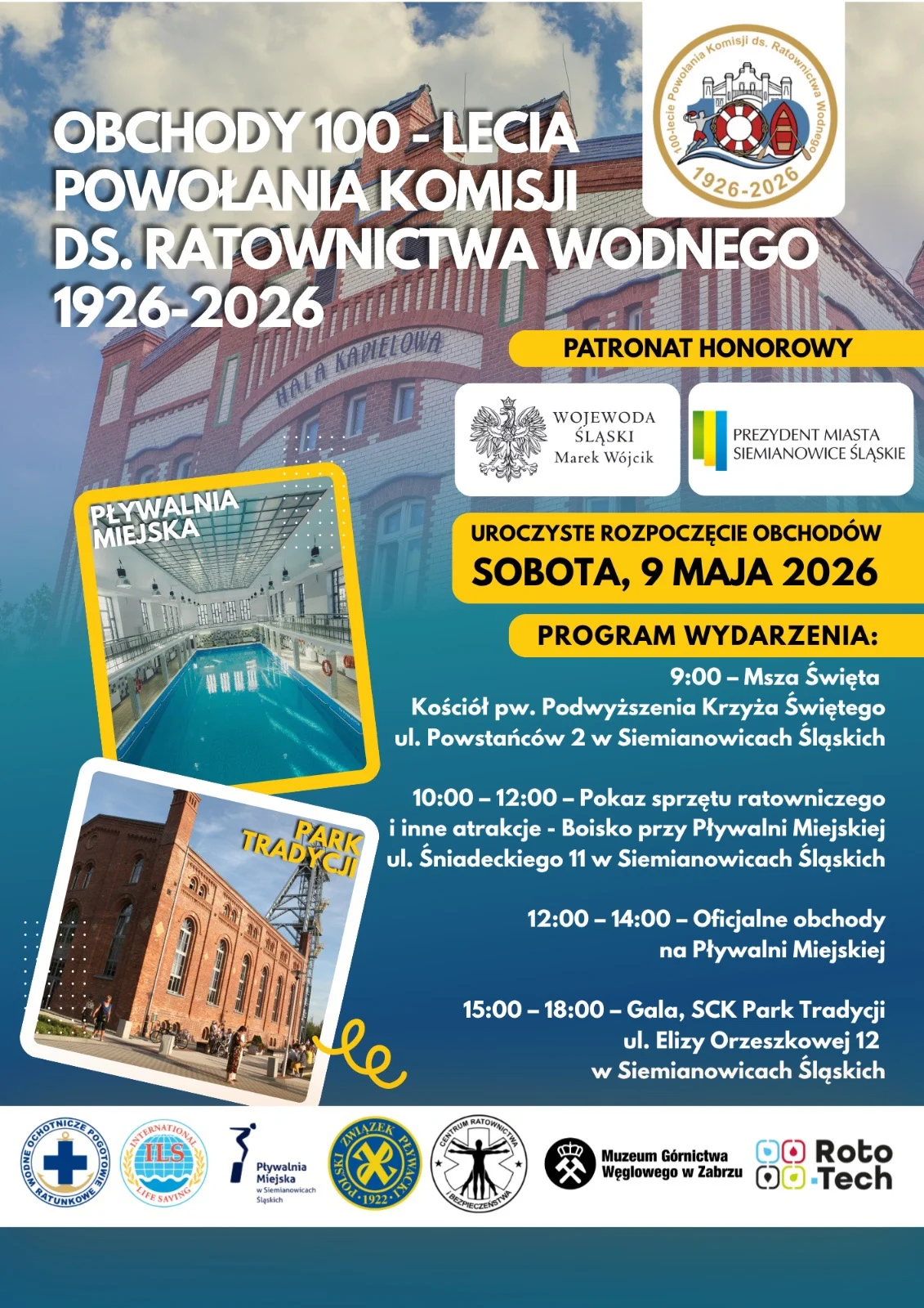 Siemianowice Śląskie będą gospodarzem wyjątkowych obchodów związanych ze 100-leciem powołania Komisji ds. Ratownictwa Wodnego przy Polskim Związku Pływackim. Jubileuszowe wydarzenie odbędzie się w sobotę, 9 maja 2026 roku. W programie znalazły się m.in. msza, pokazy sprzętu ratowniczego, oficjalne uroczystości na Pływalni Miejskiej oraz gala w Parku Tradycji.