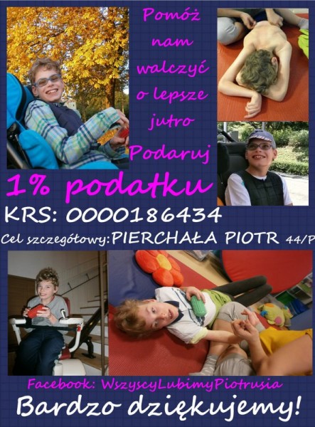 Pragnę serdecznie podziękować, tym spośród Państwa, którzy już w minionym roku zechcieli przekazać swój 1% na rzecz mojegosynka. Niestety nie znam danych osobowych podatników, gdyż Fundacja ich nie udostępnia.Dzięki środkom z 1% udało nam się opłacić część prywatnej rehabilitacji, dopłacić do kilku sprzętów rehabilitacyjnych, kupować leki, które synek przyjmuje na stałe.Pozwalam sobie prosić po razdrugi o pomoc. W imieniu swoim i Piotrusia, z całego serca za nią dziękuję! – mówi Olga Zawadzka-Pierchała