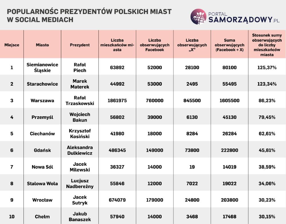 Jak czytamy na stronach portalu, najpopularniejszym prezydentem spośród włodarzy polskiego miasta okazał się Rafał Piech. Liczba obserwujących go użytkowników na platformach Facebook oraz „X” przekracza obecnie 80 tys. Przy liczbie mieszkańców Siemianowic Śląskich na poziomie 63 tys. (dane GUS za 2023 r.), dało wynik procentowy wynoszący 125,37 proc.