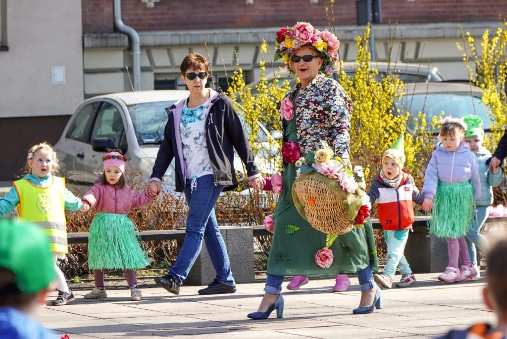 Dzieci przybyły na Rynek w kolorowym korowodzie, który zwracał uwagę przechodniów i ożywił przestrzeń przed zabytkowym budynkiem siemianowickiego Ratusza. Na czele pochodu szła Pani Wiosna ubrana w kwieciste stroje i niosąca wiklinowy kosz pełen kwiatów.