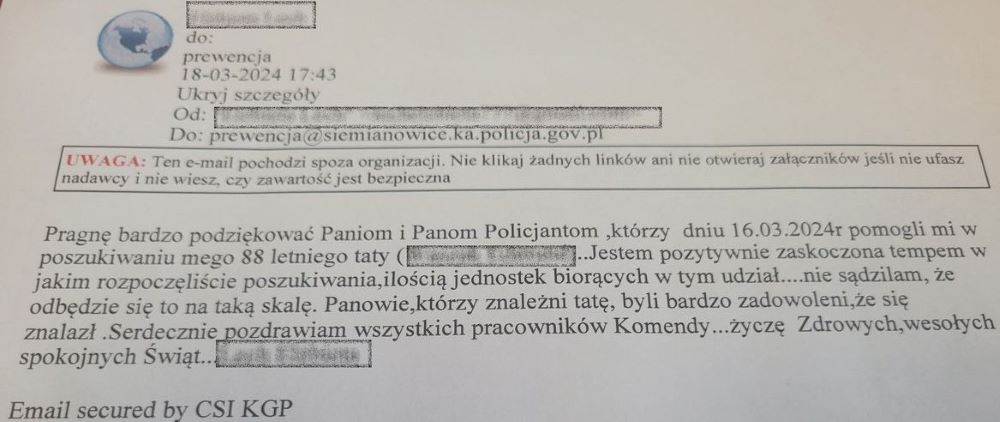 Na ręce Komendanta Miejskiego Policji w Siemianowicach Śląskich wpłynęły podziękowania od córki, która zgłosiła zaginięcie ojca. Wcześniej próbowała ona na własną rękę szukać 88-latka, jednak nie umiała go znaleźć. Dyżurny natychmiast wdrożył odpowiednie procedury i skierował patrol do roztrzęsionej kobiety, aby uzyskać więcej informacji o seniorze i otrzymać jego fotografię. Na szczęście po chwili 88-latek odnalazł się, a zgłaszająca była bardzo zaskoczona szybkością działań Policji.