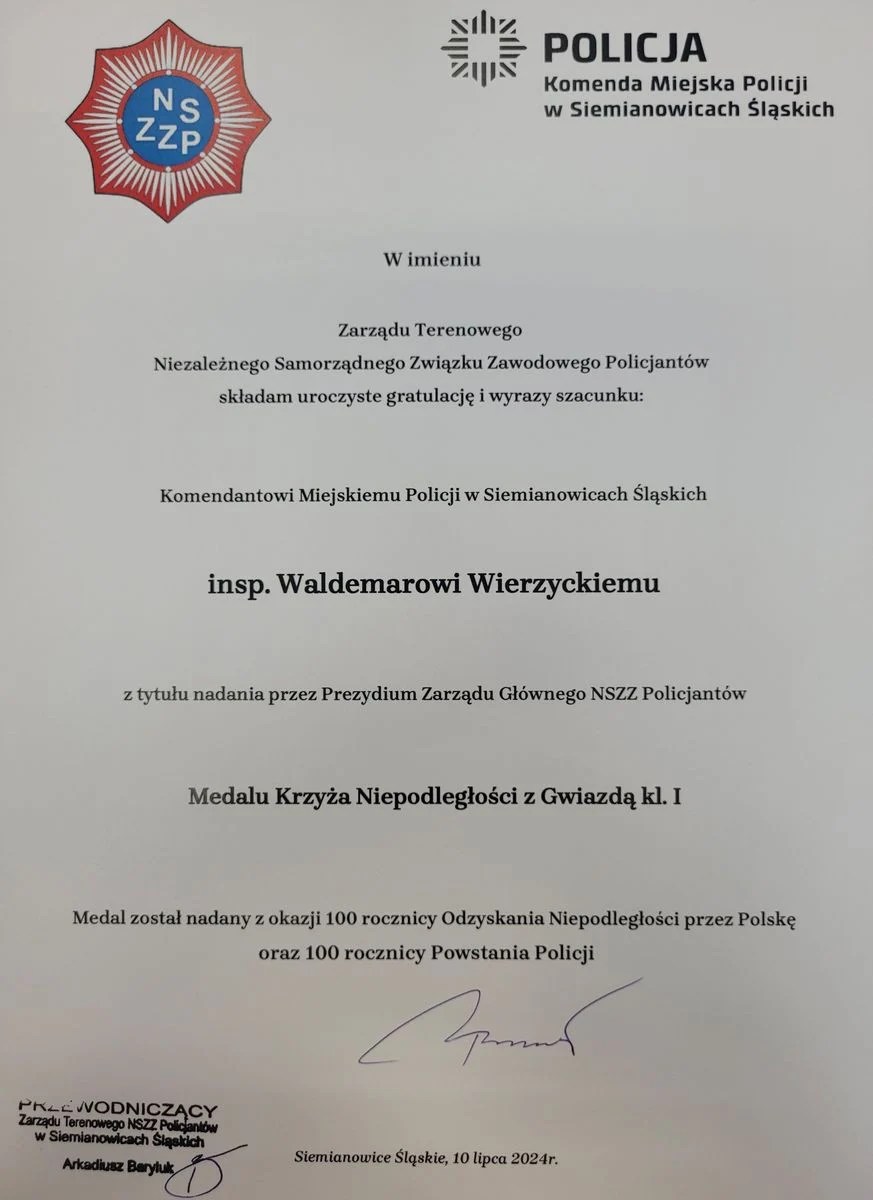 Podczas siemianowickich obchodów Święta Policji gospodarz uroczystości insp. Waldemar Wierzycki został wyróżniony Medalem Krzyża Niepodległości z Gwiazdą kl. I. Odznaczenie zostało wręczone przez Przewodniczącego Zarządu Wojewódzkiego NSZZ Policjantów asp.szt. Michała Szczęśniaka oraz Przewodniczącego Terenowego asp. Arkadiusza Baryluka. Podczas uroczystej zbiórki zostały wręczone także przez związki zawodowe Odznaki Złote Honorowe, którą odebrał między innymi I Zastępca mł.insp. Piotr Bańka.