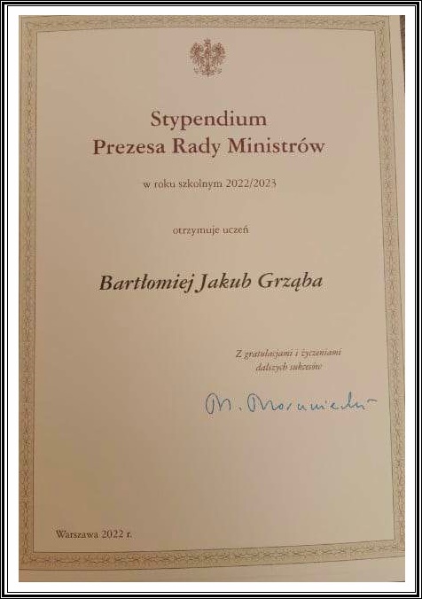Stypendium Prezesa Rady Ministrów dla ucznia Śniadeka!
