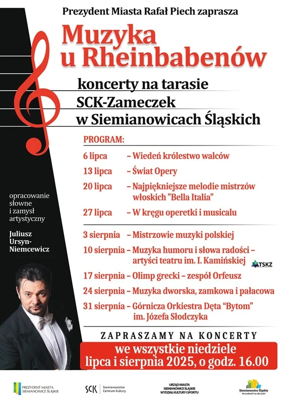 W każdą niedzielę wakacji o godzinie 16:00 taras Siemianowickiego Centrum Kultury – Zameczek wypełni się muzyką. Cykl „Muzyka u Rheinbabenów” to propozycja dla wszystkich, którzy chcą spędzić letnie popołudnie przy dźwiękach klasyki, opery i operetki. Wstęp na koncerty jest wolny.