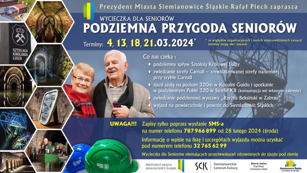 Prezydent Rafał Piech zaprasza siemianowickich seniorów na wycieczkę do Sztolni Królowej Luizy w Zabrzu. W programie wyjazdu podziemny spływ łódkami oraz zwiedzenie wystawy Rzeźba – Beksiński na poziomie 320. Ekspozycja, która jest połączeniem sztuki i industrialnego dziedzictwa regionu, oferuje nie tylko możliwość podziwiania dzieł mistrza, ale także stanowi okazję do przeżycia niezwykłej przygody w przestrzeni, gdzie sztuka współgra z historią.