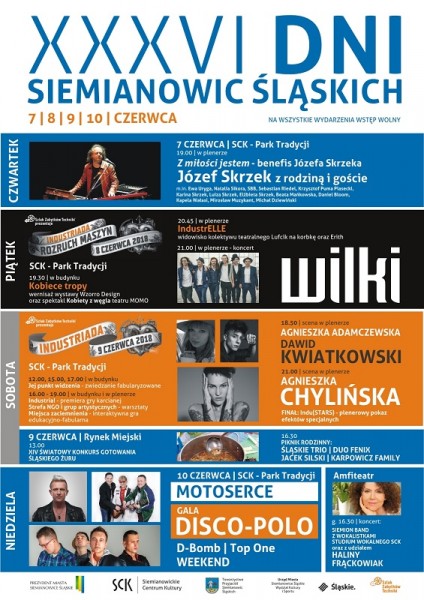 Świętowanie rozpoczniemy w czwartek 7 czerwca od wyjątkowego koncertu „Z miłości jestem”, będącego benefisem z okazji urodzin wybitnego siemianowickiego muzyka Józefa Skrzeka. Na program koncertu, który rozpocznie się o godzinie 19.00 złożą się muzyczne odsłony z różnych okresów bogatej twórczości artysty. Na scenie pojawią się osobowości polskiej sceny muzycznej m.in. Sebastian Riedel, Ewa Uryga i Dariusz Ziółek, Natalia Sikora, Kapela Wałasi, Daniel Bloom, Krzysztof Puma Piasecki, Beata Mańkowska i inni. Wystąpią również córki Józefa Skrzeka – Luiza, Karina i Elżbieta. Finałowe brzmienie będzie należało do legendarnej formacji SBB w składzie: Józef Skrzek, Anthimos Apostolis, Jerzy Piotrowski.