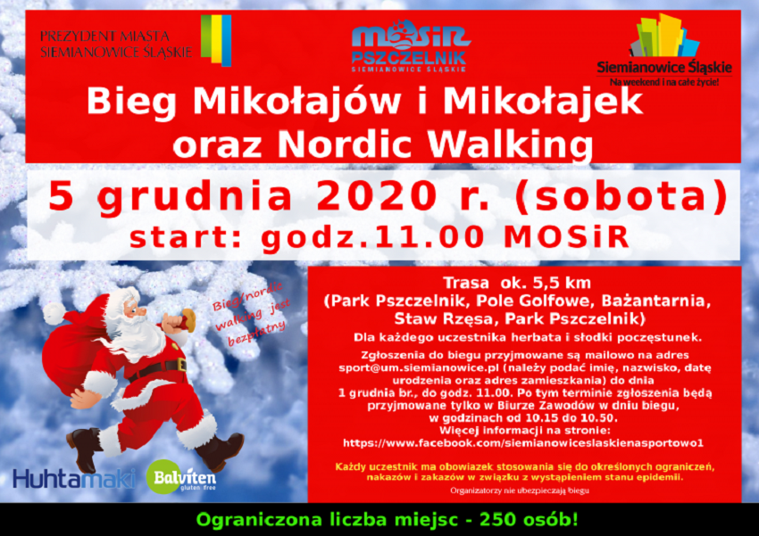 Wydział Kultury i Sportu Urzędu Miasta Siemianowice Śląskie oraz Miejski Ośrodek Sportu i Rekreacji „Pszczelnik” w Siemianowicach Śląskich zapraszają 5 grudnia br. (sobota) na „Bieg Mikołajów i Mikołajek oraz Nordic Walking” o godz. 11.00.