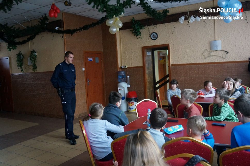 Policjant z Zespołu ds. Nieletnich i Patologii od początku tygodnia ponownie przeprowadził kilka spotkań z młodzieżą szkolną. Mundurowy spotkał się z milusińskimi w Bibliotece Miejskiej, Siemianowickim Centrum Kultury oraz "Jarzębince". Ferie to dla nich czas odpoczynku i możliwość skorzystania z ciekawych zajęć, a dla mundurowego doskonała okazja, aby przypomnieć o podstawowych zasadach bezpieczeństwa, o których podczas zabawy tak łatwo zapomnieć. W ramach kampani MSWiA "Kręci mnie bezpieczeństwo przez cały rok szkolny" st.sierż. Krystian Gawron zachęcał dzieci przede wszystkim do aktywnego spędzania wolnego czasu, który powinien być bezpieczny dla nich oraz innych osób. Przestrzegał przed wchodzeniem na zamarznięte zbiorniki wodne oraz zjeżdzania na sankach, gdy w pobliżu jest droga, chodnik bądź drzewa czy inne niebezpieczne przedmioty.