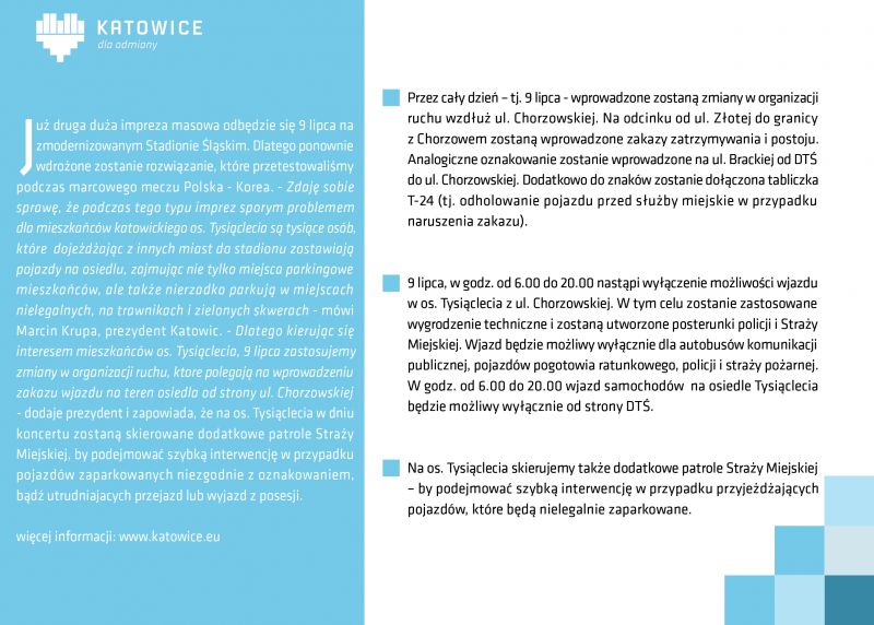 – Zdaję sobie sprawę, że podczas tego typu imprez sporym problemem dla mieszkańców katowickiego os. Tysiąclecia są tysiące osób, które dojeżdżając z innych miast do stadionu zostawiają pojazdy na osiedlu, zajmując nie tylko miejsca parkingowe mieszkańców, ale także nierzadko parkują w miejscach nielegalnych, na trawnikach i zielonych skwerach – mówi Marcin Krupa, prezydent Katowic. – Dlatego kierując się interesem mieszkańców os. Tysiąclecia, 9 lipca zastosujemy zmiany w organizacji ruchu, które polegają na wprowadzeniu zakazu wjazdu na teren osiedla od strony ul. Chorzowskiej – dodaje prezydent i zapowiada, że na os. Tysiąclecia w dniu koncertu zostaną skierowane dodatkowe patrole Straży Miejskiej, by podejmować szybką interwencję w przypadku pojazdów zaparkowanych niezgodnie z oznakowaniem, bądź utrudniających przejazd lub wyjazd z posesji.