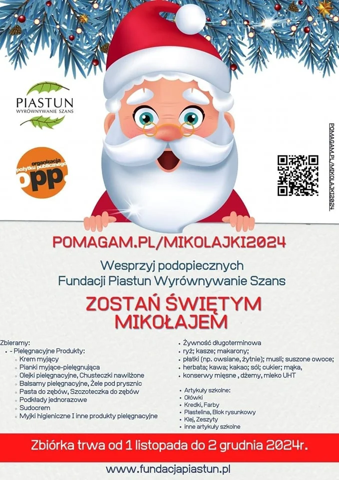 Trwa kolejna edycja charytatywnej akcji „Zostań Świętym Mikołajem”, organizowanej przez Fundację Piastun Wyrównywanie Szans. Jak co roku, fundacja zaprasza szkoły, przedszkola, firmy oraz osoby prywatne do przyłączenia się do tej pięknej inicjatywy.