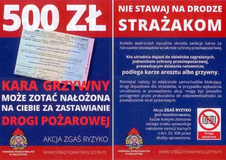 Drogi pożarowe, szczególnie te na osiedlach bardzo często bywają nieprzejezdne. Są zastawione ciasno zaparkowanymi samochodami. Taka sytuacja niestety bezpośrednio przekłada się w razie konieczności przeprowadzenia akcji ratowniczej na jej utrudnienie i znaczne opóźnienie a drogi pożarowe nie będą spełniały swej głównej funkcji w przypadku wystąpienia zagrożenia życia lub zdrowia mieszkańców.