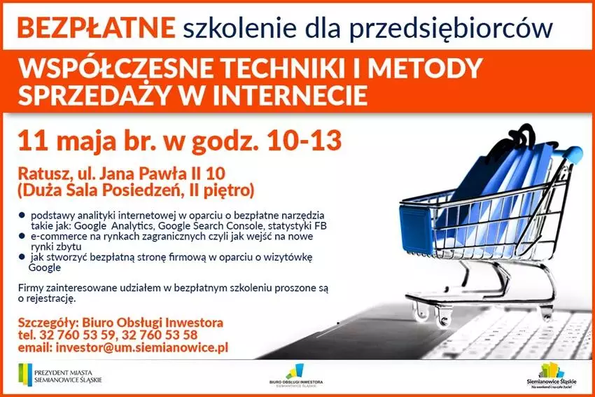 Zaprasza się 11 maja przedsiębiorców oraz pracowników z terenu Metropolii Górnośląsko-Zagłębiowskiej do Siemianowic Śląskich na bezpłatne szkolenie ze współczesnych technik i metod sprzedaży w Internecie.