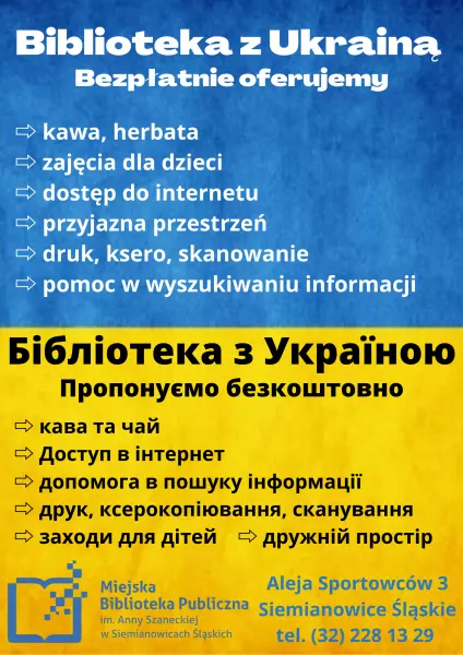 W związku z trwającą wojną na Ukrainie, Biblioteka Miejska chciałaby pomóc swoim sąsiadom w potrzebie, szczególnie tym przebywającym w naszym mieście.