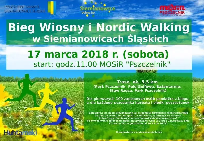 Wydział Kultury i Sportu Urzędu Miasta Siemianowice Śląskie oraz Miejski Ośrodek Sportu i Rekreacji „Pszczelnik” w Siemianowicach Śląskich oraz zapraszają 17 marca br. (sobota) o godz. 11.00 na „Bieg Wiosny oraz Nordic Walking”. Tradycyjnie sympatycy biegania i nordic walking przemierzą 5,5 kilometrową trasę, która niezmiennie prowadzi alejkami Parku „Pszczelnik” do Pola Golfowego przez „Bażantarnię”, staw „Rzęsa” do mety w Parku „Pszczelnik”.