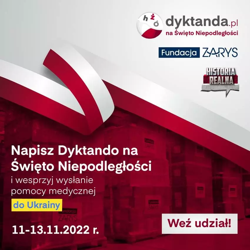 Środki zgromadzone podczas tego wydarzenia trafią do Fundacji Zarys, która przeznaczy je na pomoc medyczną wysyłaną do Ukrainy. Do tej pory fundacja wysłała już osiem tirów z pomocą o łącznej wartości 2,6 mln zł. W ramach Dyktanda na Święto Niepodległości gromadzimy środki na kolejnego tira.