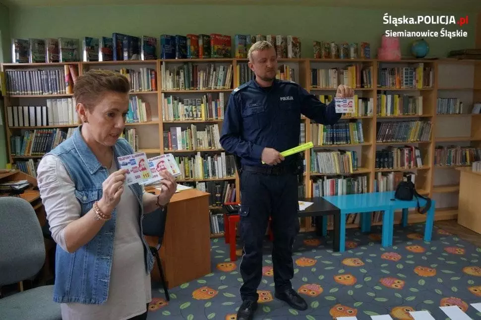 Ciekawe zajęcia przygotowane przez panie bibliotekarki zostały wzbogacone o cenne rady dzielnicowego z zakresu szeroko rozumianego bezpieczeństwa. Policjant przede wszystkim przekazał wiedzę dotyczącą zachowań maluchów w pobliżu ulicy, jak również na samych przejściach dla pieszych. Aby milusińscy byli widoczni na drogach, rozdał każdemu odblaskowe opaski.