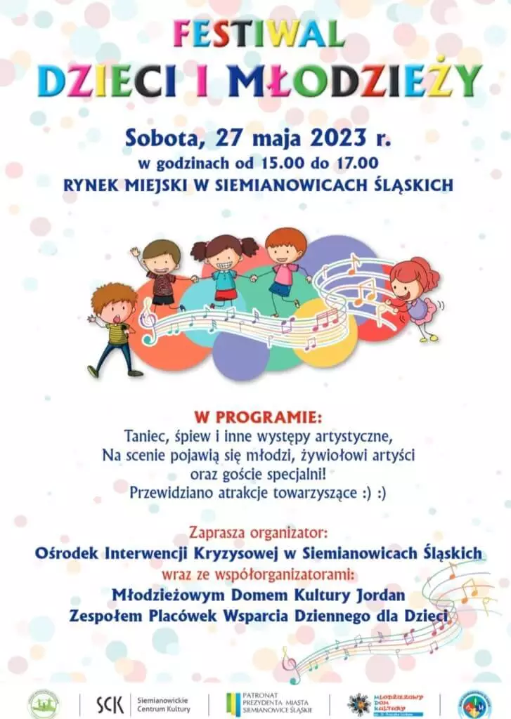 Ośrodek Interwencji Kryzysowej serdecznie zaprasza na Festiwal Dzieci i Młodzieży, który odbędzie się w sobotę 27 maja br. w godzinach 15:00-17:00 na Rynku Miejskim w Siemianowicach Śląskich.
