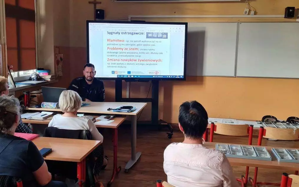 Niedawno policyjny profilaktyk spotkał się z pracownikami MOPS-u, aby przekazać im cenne informacje związane z narkotykami. Tym razem spotkał się z gronem pedagogicznym Szkoły Podstawowej nr 11. Nauczyciele oprócz informacji dotyczących konkretnych narkotyków, objawów po ich zażyciu, mogli zobaczyć repliki środków odurzających oraz przedmiotów, które można napotkać u osób, które je zażywają.