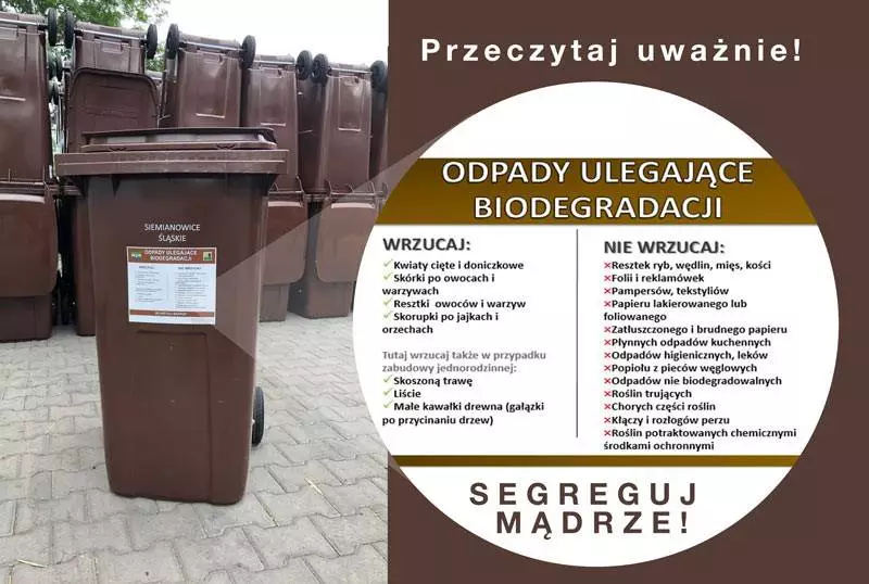 Pojemniki przeznaczone na odpady ulegające biodegradacji są koloru brązowego o pojemności 240l. Pojemniki te są wyposażone w otwory wentylacyjne oraz kratki odciekowe, mające na celu zapobiegania nieprzyjemnych zapachów oraz ułatwienie gromadzenia frakcji „BIO”.