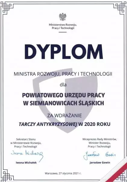 27 stycznia br. Jarosław Gowin, Minister Rozwoju, Pracy i Technologii docenił działania siemianowickiego Powiatowego Urzędu Pracy w kontekście wdrażania Tarczy Antykryzysowej oraz wspierania rodzimych przedsiębiorców w - trudnym - 2020 roku. Stosowny dyplom zawiśnie zapewne w widocznym i eksponowanym miejscu.