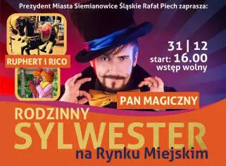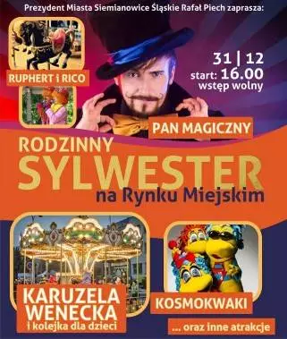 Prezydent Miasta Siemianowice Śląskie Rafał Piech i Siemianowickie Centrum Kultury zapraszają 31 grudnia w godzinach 16.00-20.00 na Rynek Miejski w Siemianowicach, na Rodzinnego Sylwestra! Po raz pierwszy zapraszamy całe rodziny, do spędzenia sylwestrowego popołudnia na wspólnej zabawie, a zaplanowaliśmy wiele atrakcji.