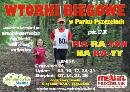 Miejski Ośrodek Sportu i Rekreacji "Pszczelnik" w Siemianowicach Śląskich serdecznie zaprasza miłośników biegania do udziału w dziewiątej edycji, wakacyjnej imprezy rekreacyjnej pod nazwą "Wtorki Biegowe - Maraton na Raty".