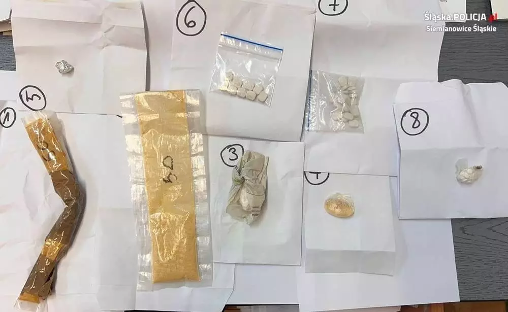 Policjanci z Wydziału Kryminalnego zatrzymali 18-letniego mieszkańca powiatu będzińskiego. Na terenie jego posesji kryminalni znaleźli znaczną ilość narkotyków. Narkotestery wykazały, że zabezpieczone sypkie substancje noszą cechy kokainy, natomiast kilkadziesiąt sztuk tabletek to ekstazy. Zatrzymany usłyszał zarzut za posiadanie znacznej ilości narkotyków i na 3 miesiące trafił do aresztu.