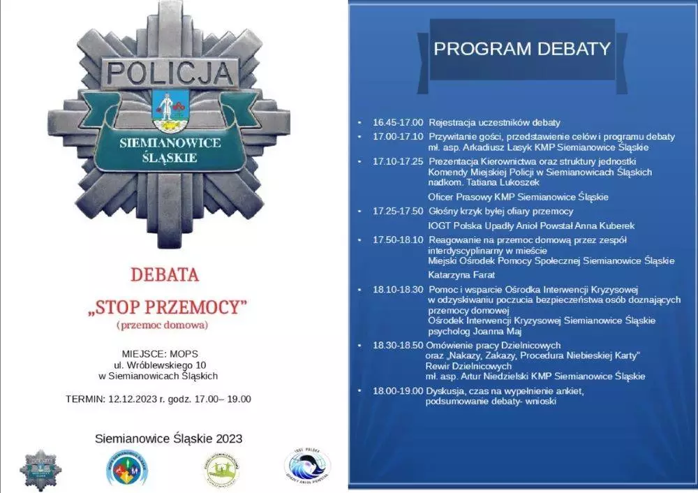 Komendant Miejski Policji w Siemianowicach Śląskich insp. Waldemar Wierzycki wspólnie z Miejskim Ośrodkiem Pomocy Społecznej zapraszają do udziału w debacie pn. "Stop przemocy", która odbędzie się w dniu 12 grudnia o godzinie 17.00 w budynku należącym do MOPS przy ul. Wróblewskiego 10. Zaproszeni prelegenci z Ośrodka Interwencji Kryzysowej oraz stowarzyszenia "IOGT Polska Upadły Anioł Powstał" podzielą się swoją fachową wiedzą oraz doświadczeniem, które pozwoli zatrzymać przemoc domową.