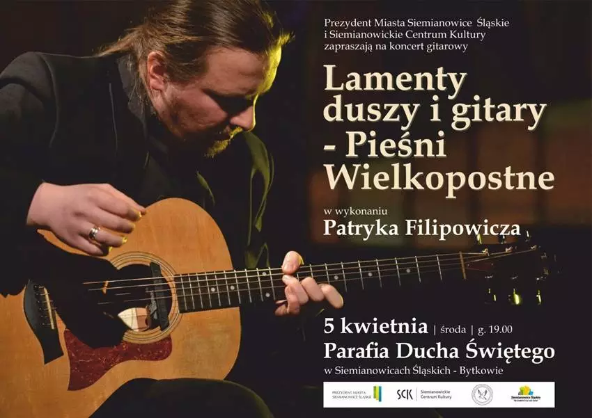 Prezydent Siemianowic Śląskich i Siemianowickie Centrum Kultury zapraszają 5 kwietnia, o godz. 19.00, na koncert "Lamenty duszy i gitary – Pieśni Wielkopostne" w wykonaniu Patryka Filipowicza, który odbędzie się w Parafii Ducha Świętego w Bytkowie.