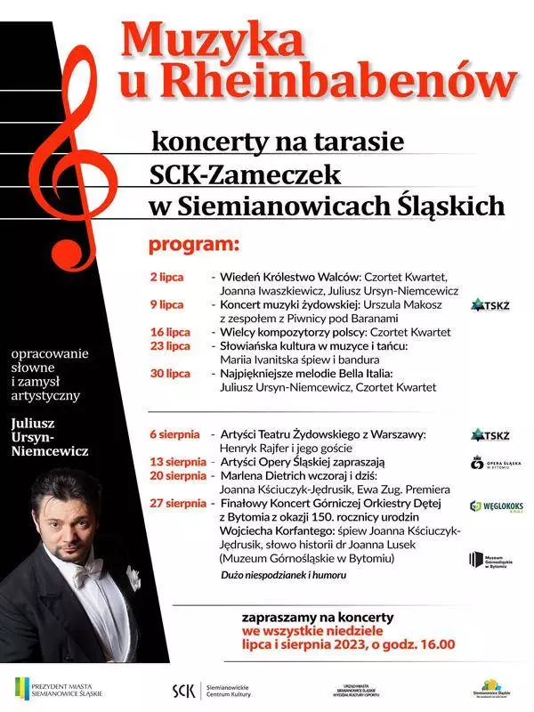 W każdą wakacyjną niedzielę o godzinie 16.00 na tarasie Siemianowickiego Centrum Kultury – Zameczek odbywać się będą koncerty z cyklu „Muzyka u Rheinbabenów”, opracowane i poprowadzone przez Juliusza Ursyna-Niemcewicza. Wstęp wolny.