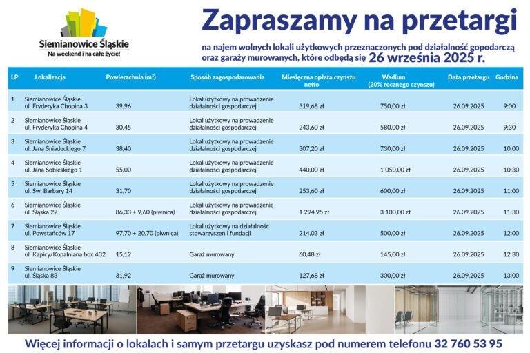 Urząd Miasta Siemianowice Śląskie ogłasza przetargi ustne nieograniczone na wynajem lokali użytkowych oraz dzierżawę garaży murowanych. Przetargi odbędą się 26 września 2025 roku w Sali Konferencyjnej w budynku Urzędu Miasta przy ul. Michałkowickiej 105.