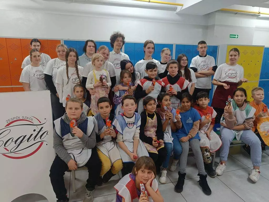 Podczas warsztatów dzieci wspierały także uczennice i uczniowie z różnych klas Cogito, którzy nadzorowali wykonanie zadań, dbając o porządek i pomagając najmłodszym. Po intensywnej pracy dzieci mogły odpocząć przy kubku świątecznej herbaty.