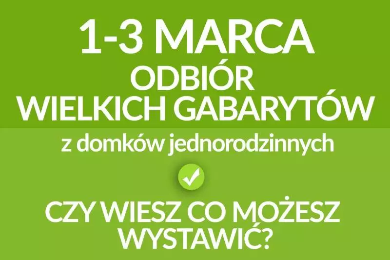 Urząd Miasta przypomina wszystkim mieszkańcom zabudowy jednorodzinnej, że w najbliższym tygodniu, zgodnie z obowiązującym harmonogramem, w dniach 1-3 marca odbędzie się pierwszy odbiór frakcji wielkogabarytów.