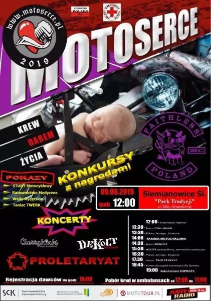 W ramach Dni Siemianowic Śląskich w niedzielę 9 czerwca klub motocyklowy Faithless MC Poland oraz Siemianowickie Centrum Kultury zapraszają na teren przy SCK – Parku Tradycji, gdzie o godzinie 12.00 rozpocznie się MOTOSERCE, czyli charytatywna zbiórka krwi połączoną z koncertami zespołów rockowych, widowiskowymi pokazami i konkursem z nagrodami. Do godziny 19.00 w ramach Motoserca wystąpią zespoły Cherrybombs i Dekolt.